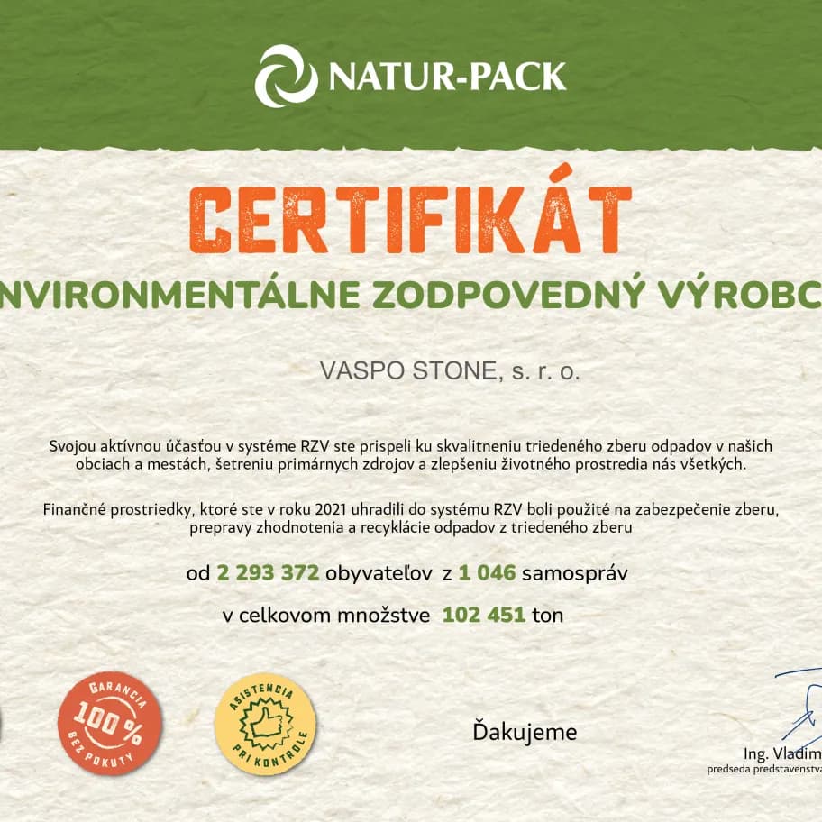 - firma VASPO STONE s.r.o. svojimi výrobkami neznečisťuje a neohrozuje životné prostredie, nakoľko má bezodpadovú technológiu .